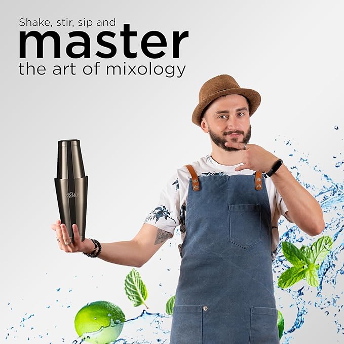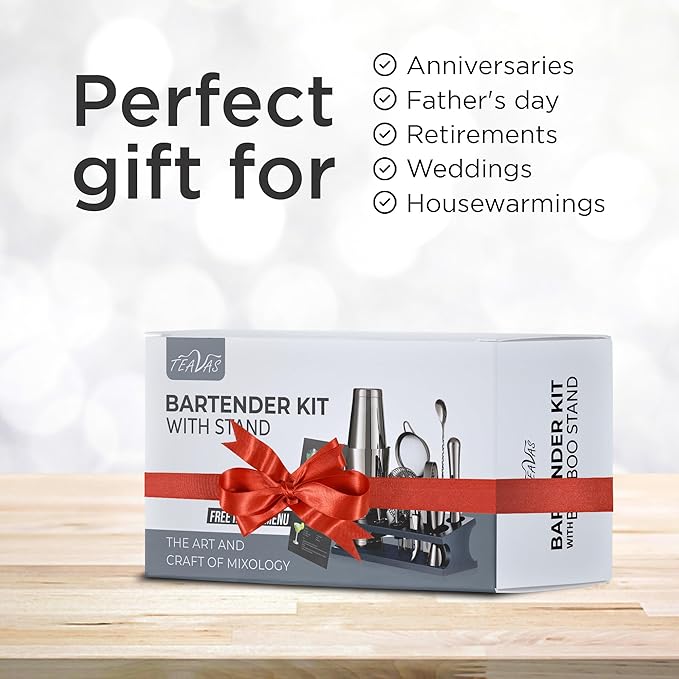 - 13-piece premium bar set: This bartender kit of stainless steel bar tools, completes with Boston shaker, mixing spoon, corkscrew and 2 pourers, Hawthorne strainer, muddler, mesh strainer, ice tongs, Japanese 1oz/2oz jigger, a high-quality bamboo stand and a recipe menu.