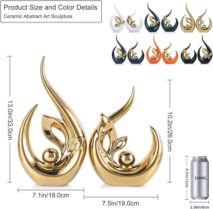 - Striking Centerpieces: This set of bright gold abstract ceramic sculptures, available in large (H13.0 x L7.1 inches) and small (H10.2 x L7.5 inches) sizes, serves as dynamic centerpieces for tables or dining room table centerpiece. Their fluid form and lustrous gold accents make them a luxurious addition to any center table decor or coffee table centerpiece decor.