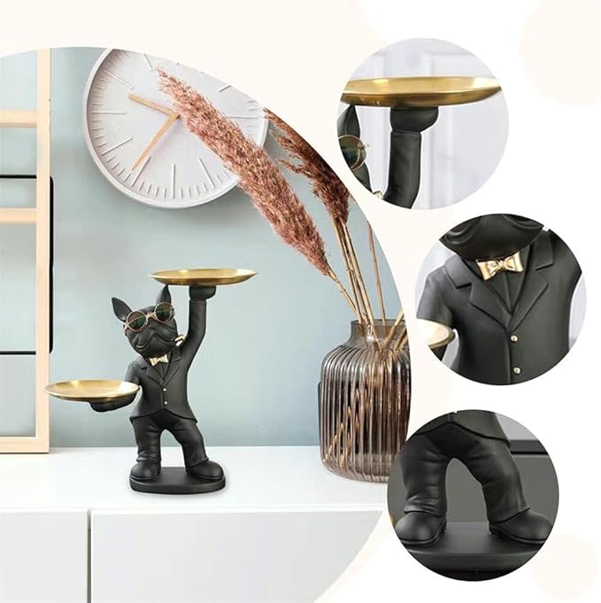 - DIMENSIONS: Measuring a substantial 13.2*8.7*12.8in/33.5*22*32.5cm in size, this charming bulldog comes adorned with two adorable trays and cute glasses to add a touch of whimsy and sophistication to your decor. The trays are expertly fashioned from durable stainless steel, with a large tray diameter of 6.69in/17cm and a small tray diameter of 5.51in/14cm, making it the perfect size – not too big, yet not too small.