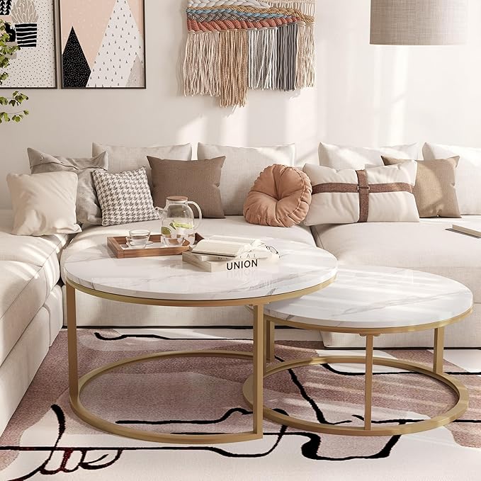 WiberWi Round Coffee Table Nesting Tables Set of 2, Large : Ø 34.0", Small : Ø 26.0", Modern Design Coffee Tables for Living Room, Gold Metal Frame Circle Cocktail Table, High Glossy Faux White Marble