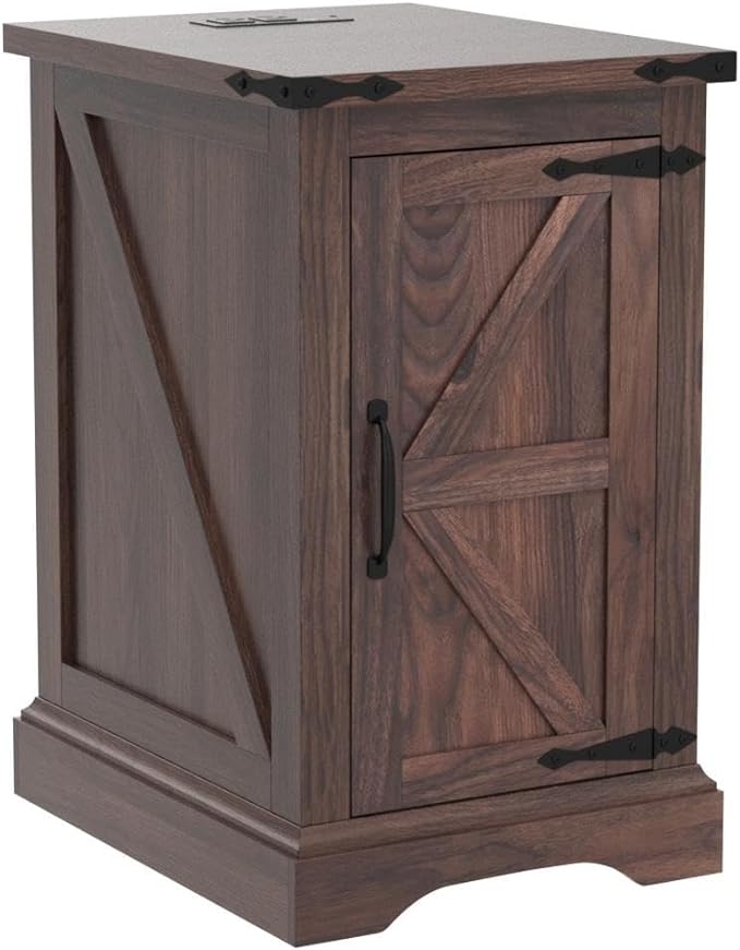 JXQTLINGMU Nightstand with Charging Station, Rectangular Farmhouse End Table with Barn Door and Adjustable Storage Shelf, 17" Deep Wood Rustic Sofa Side Table for Living Room, Bedroom, Brown