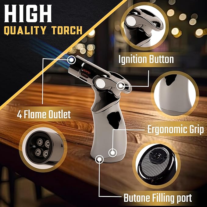 Whiskey Smoker Kit | Cocktail Smoker Kit| Bourbon Smoker Kit| Old Fashioned Smoker Kit with Quad Flame Torch, 6 Wood Chips & Wooden Box for Smoking Drinks| Whiskey Gift for Men (No Butane Incl.)