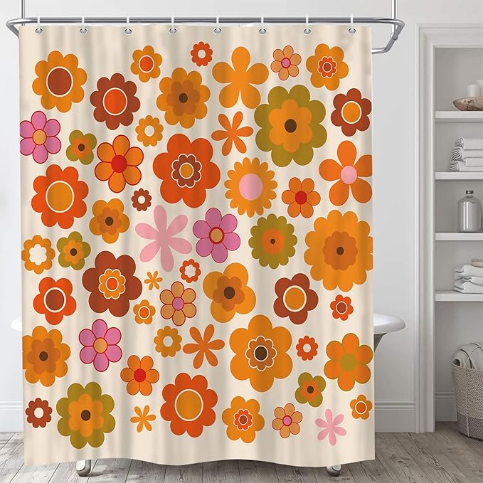 Retro Flowers Camper RV Shower Curtain for Travel Trailer Bathroom, Groovy 70s Funky Boho Camping Small Shorter Fabric Shower Curtains Set, Happy Camp Outdoor Decor Accessories with Hooks 47X64 inch