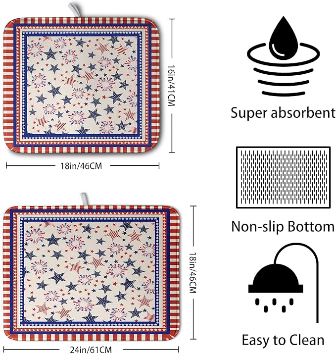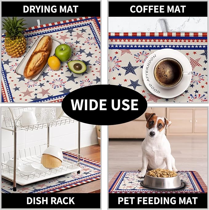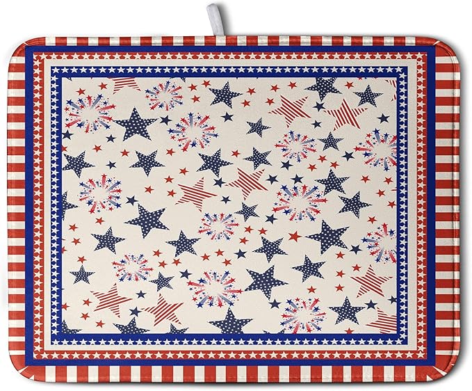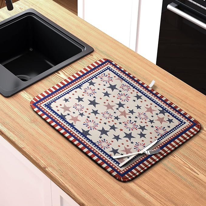 Happy 4th of July Patriotic Dish Drying Mat 16 x 18 Inch US Independence Day Vintage Star Kitchen Drying Mat Blue White Red Dish Drainer Mats Super Absorbent Dish Rack Pad for Coffee Bar Sinks