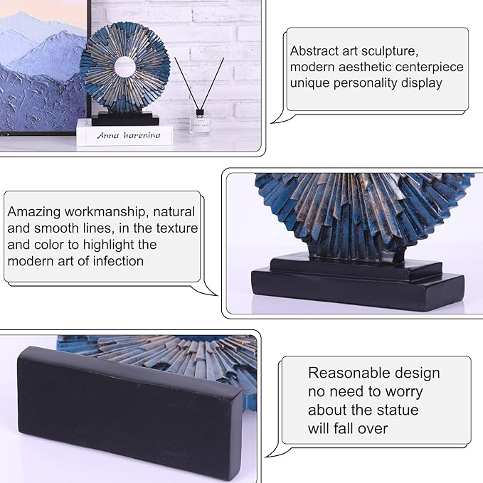 - Contemporary Round Sculpture: Elevate your home decor with this exquisite round sculpture, a perfect centerpiece for any room. Crafted with meticulous attention to detail, this Blue statue exudes elegance and adds a touch of sophistication to your living room, bedroom, coffee table, entrance, kitchen, bathroom, mantelpiece, and above cabinet decor.