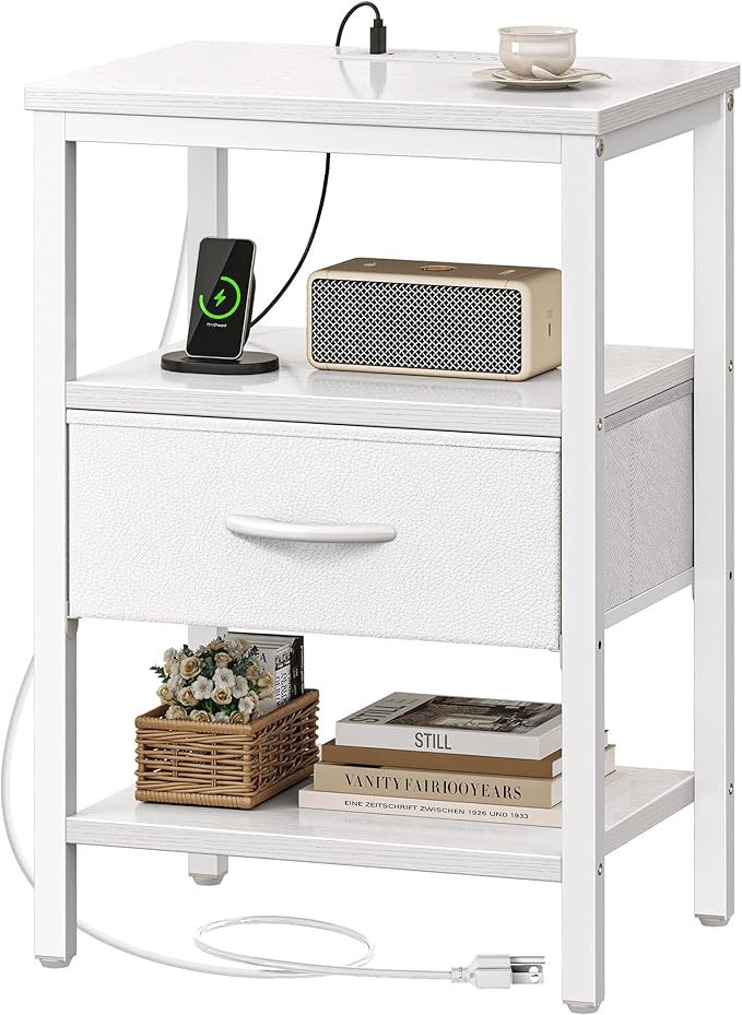 - 【Go for a Long Time】: White shelves and metal frame adds white fabric drawer with PU leather finish, making it a timeless classic. Sturdy P2 particle board, robust metal frame, and durable fabric drawer, all these work excellently to give this side table with charging station strong support