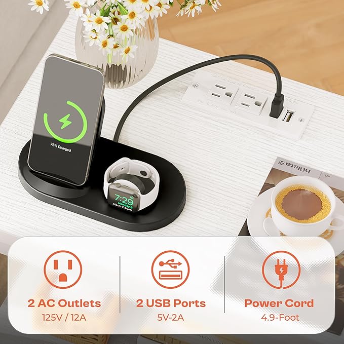 - [Go for a Long Time]: White wooden grain shelves combine white fabric and metal frame, making it a timeless classic. Sturdy P2 particle board, sturdy metal frame, and durable fabric drawer, all these work excellently to give this side table with charging station strong support