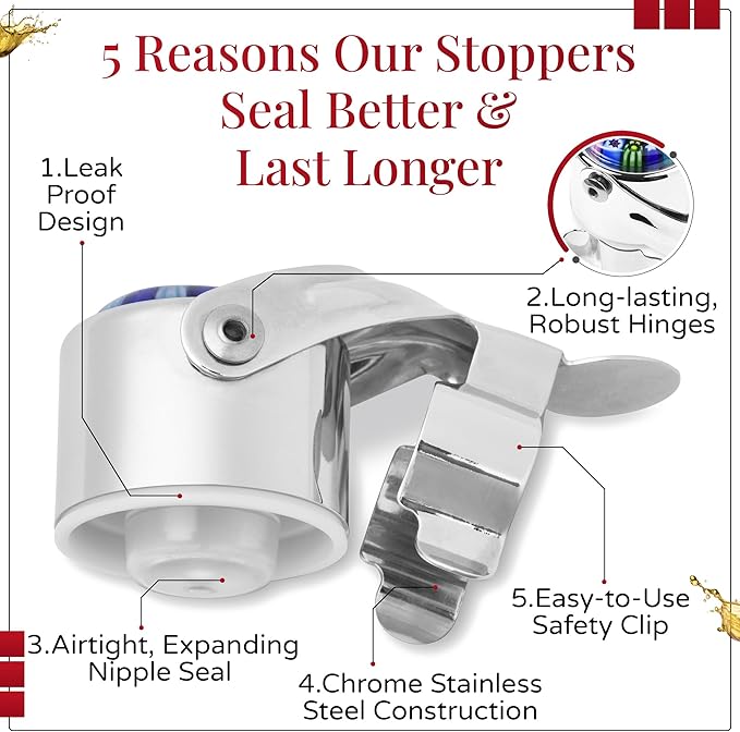 - Enduring Elegance – Delight in drink after drink with the help of your robust wine bottle stopper. It is constructed to last with a chrome steel latch, food-grade plastic seal, and sturdy hinges. If it ever breaks, we offer a lifetime replacement.
