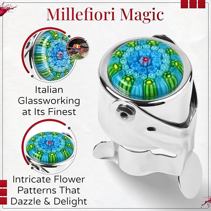 - Designed in Italy – Top your bottle with a millefiori vacuum bottle stopper that goes beyond functionality. Genuine millefiori glass, a refined Italian technique, is renowned for the flower pattern it produces.
