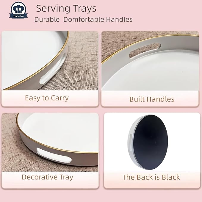 - Design: The size of the white tray is 13 inches, and it has two built-inhandles for easy carrying. lt has asimple, solid color finish with agolden top rim accent, and theedges are relatively smooth.