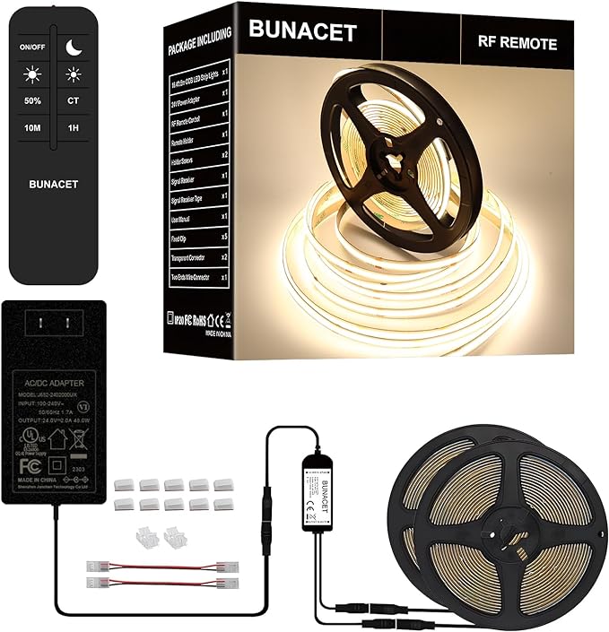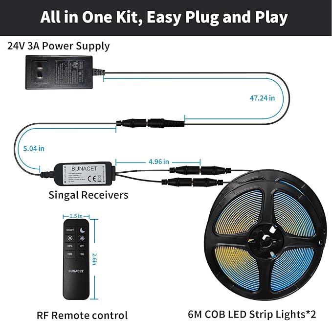 - This COB LED strip light kit includes power adapter, LED light strip, remote control (Need AAA x 2 batteries, NOT INCLUDED), signal receiver and connector etc. It can be installed and used directly, no need to purchase other accessories.