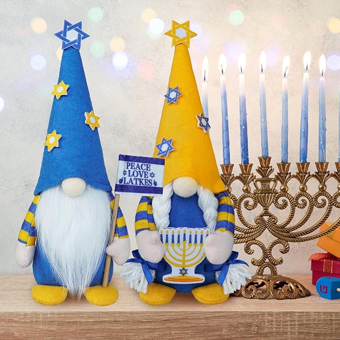 - 【Unique Design】With the unique feature and design, their hats are adorned with shining Stars of David, and hold the Menorah and flag, very cute and funny. This is a speical design for Hanukkah.this Chanukah gnome will definitely become a newest addition to gnome family! Perfect festive ornaments to your table and home decoration.