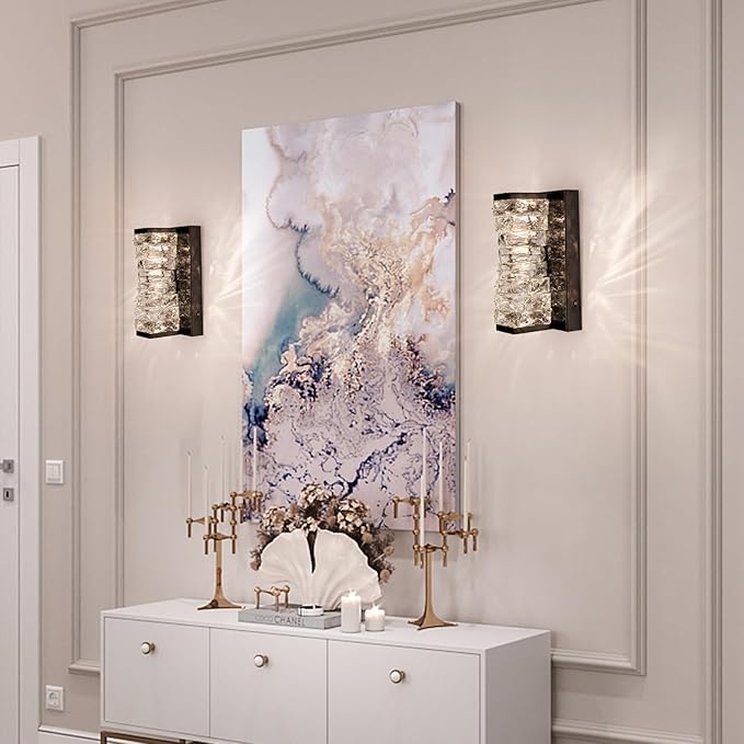 - 【Hand-cut Solid Crystal & Luxury Design 】The black luxury wall sconce is ground and polished by hand, the effect of K9 crystal refraction creates a luxury and elegant atmosphere. Every side of Crystal is different, cut by hand, Unique existence.
