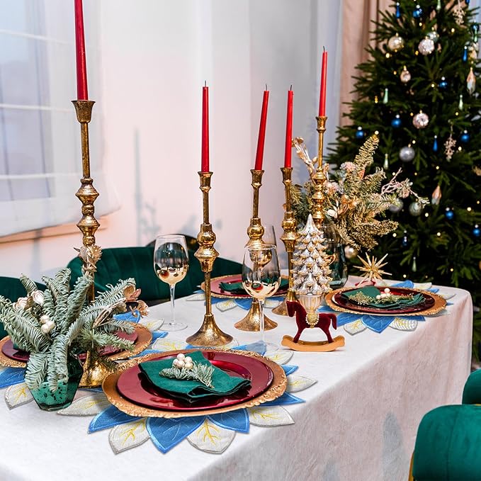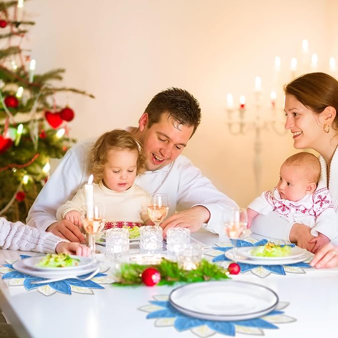 - Poinsettia Pattern: poinsettia placemats are beautiful in style, and blue embroidered placemats with poinsettia decals are the elements of Christmas, which can add a festive atmosphere to your activities