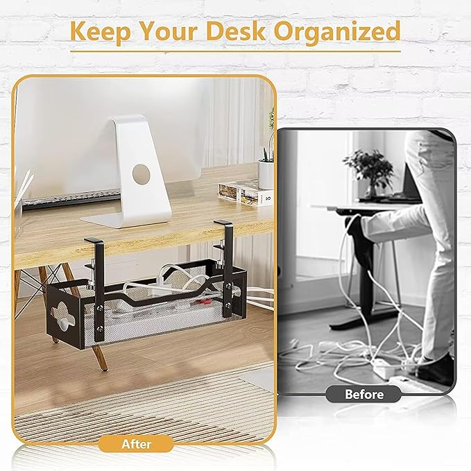 - ELEGANT UNDER DESK CORD ORGANIZER - The design of the mesh cable management frame is more beautiful and generous than that of pure iron wire products, and there is no problem putting small items in it. The design of cable management holes on both sides can help you manage cables more easily.