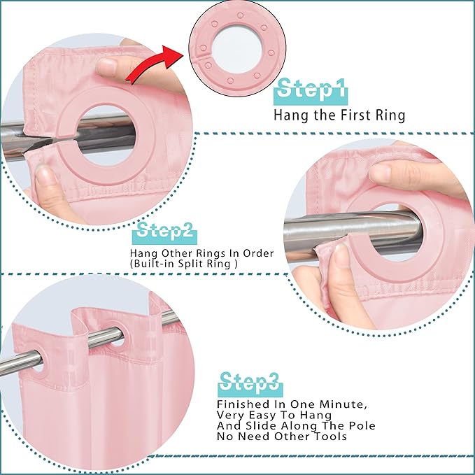- SUPER EASY TO INSTALL : This shower curtains design with High Quality Flex On Rings that you can very easy to install it in one minute.Smart design will made it easier to hang and to slide along the pole.
