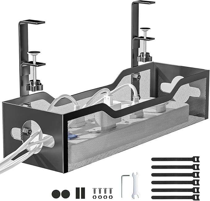 - 【Sturdy and Beautiful】Cord management under desk is made of high-quality carbon steel and holds about 15 lbs. The wire basket has 2 holes on each side of the tray to enable your cables to pass freely. Cable baskets are suitable for desk thickness use from 0.4" to 2".