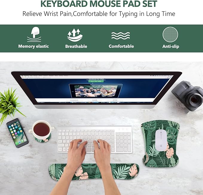 AIMSA Wrist Rest Support Mouse Pad Ergonomic, Memory Foam Keyboard Wrist Rest Set Non-Slip Easy Typing and Relieve Wrist Pain Mouse Mat for Computer Office - Pink Green Leaves
