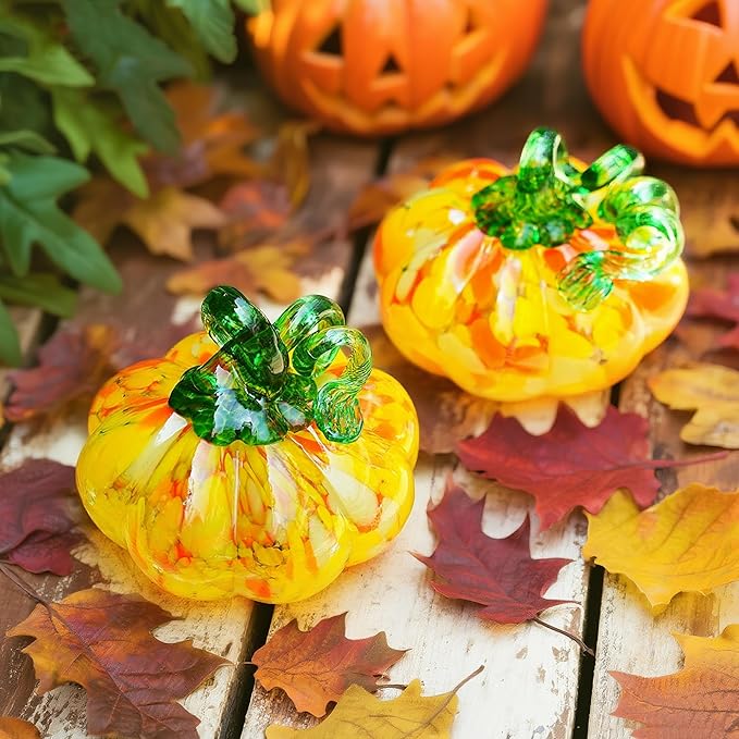 - Application:Glass blown yellow pumpkin with stem ornament is not just perfect for fall autumn harvest and Halloween home thanksgiving all Saints' day, but also good as daily home decor tabletop accents.Such as decorate tables, desks or shelves of living room, bedroom, bathroom, kitchen, reading room, classroom,indoor and outdoor