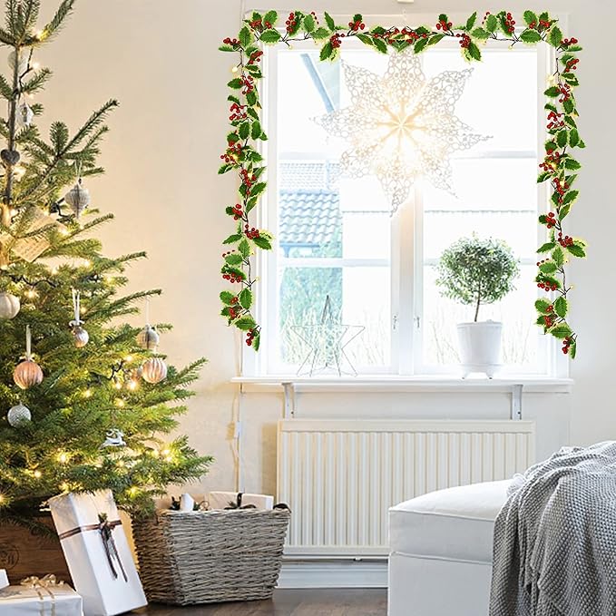 - 2 Pack Lighted Christmas Garland: Each Christmas mantle garland measures 9ft long, with individually crafted branch tips, decorated with warm white LED lights, red berries and green holly leaves, create a lively feel to your holiday decor and match any of your existing Christmas decor