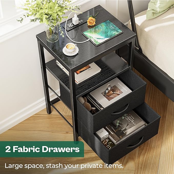 Huuger Nightstands Set of 2, End Tables with Charging Station, Side Tables with Fabric Drawers, Bedside Tables with USB Ports and Outlets, Night Stands for Bedroom, Black