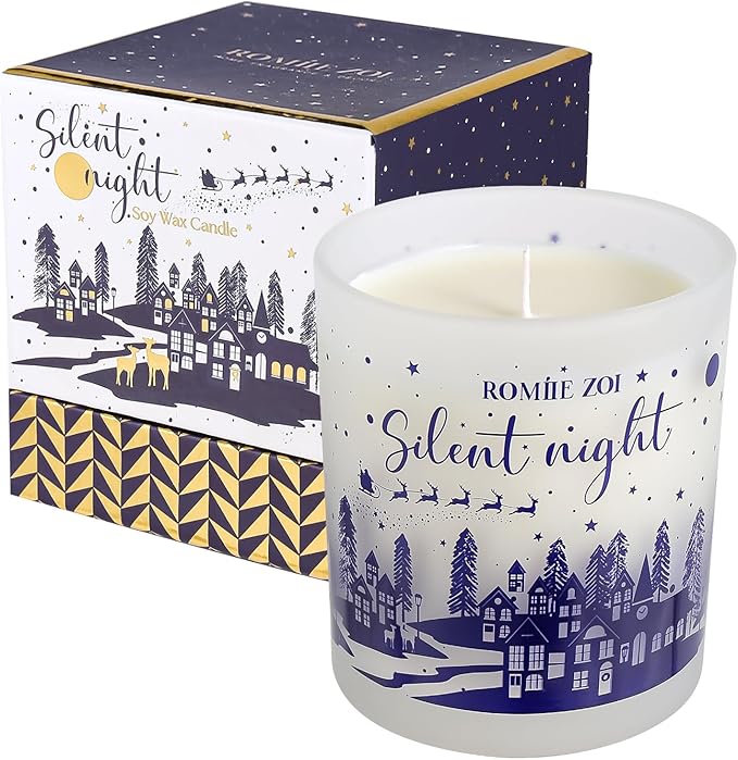 ROMIIE ZOI Christmas Scented Candle - 6oz Soy Wax Candle, Silent Night, Infused with Fresh-Cut Spruce Branches Aroma - Navy Blue Gift Box Packaged for Christmas Holiday Season Gift