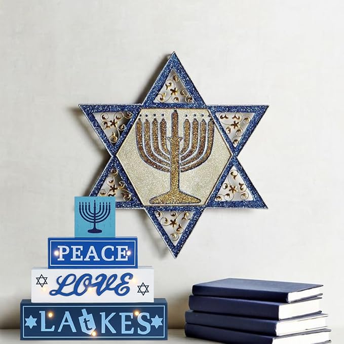 - 🕎EYE-CATCHING LED HANUKKAH DECORATIONS - This Hanukkah wood block adds excitement to the Hanukkah decor. DEWBIN wooden Hanukkah decor is a religious Hanukkah style block with the letter “PEACE LOVE LATKES”. The block has LED lights with painted menorah. Show off your faith and celebrate Hanukkah with this lovely blue wooden sign, which is a great addition to your holiday decorations. LED and the pattern of the menorah brings a warm feeling..
