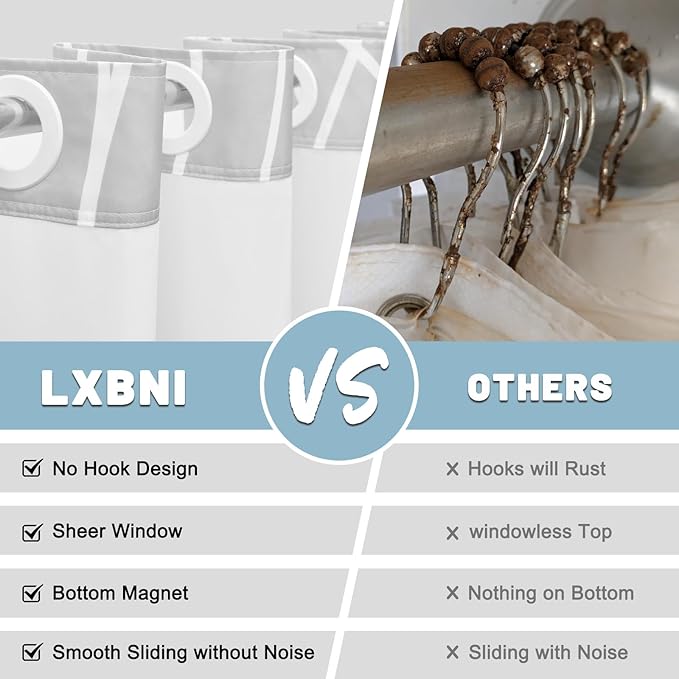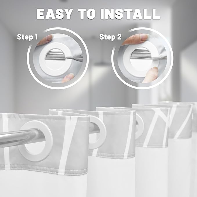 - NO Hook Design: set of shower curtain & snap on/off replaceable liner: no hooks needed design with built-in rings for easy on and off. snap-in waterproof fabric liner is removable when replacing