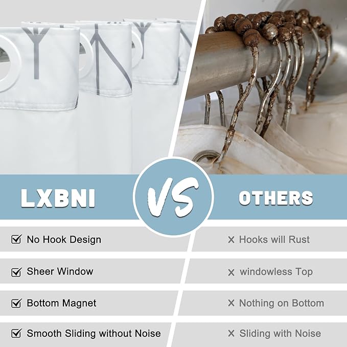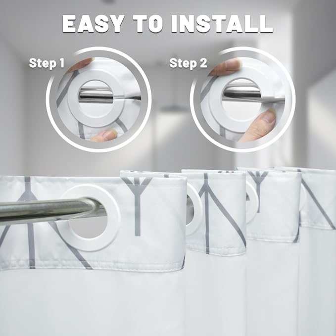 - NO Hook Design: set of shower curtain & snap on/off replaceable liner: no hooks needed design with built-in rings for easy on and off. snap-in waterproof fabric liner is removable when replacing