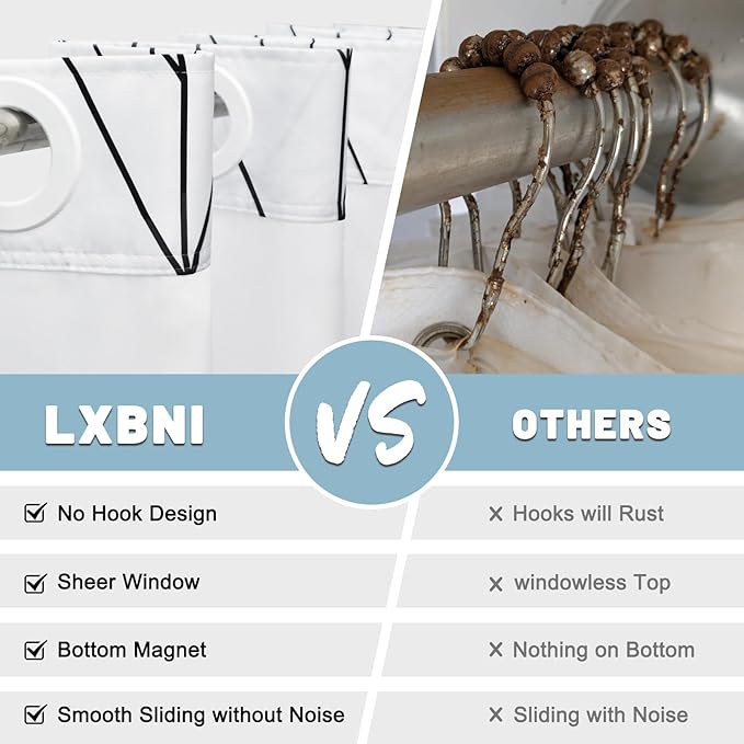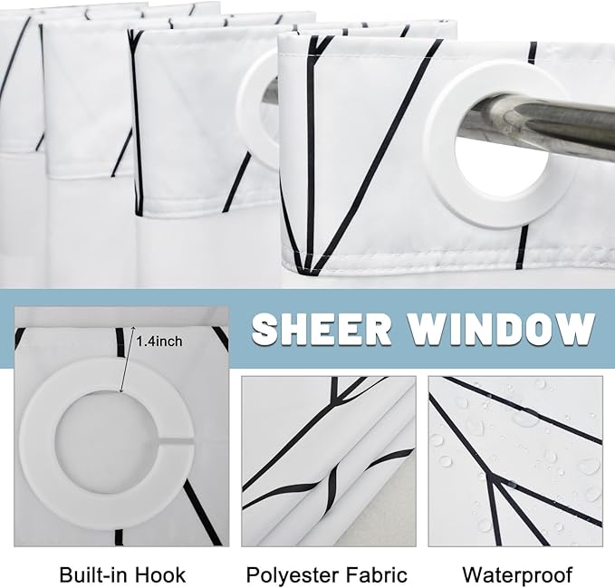 - NO Hook Design: set of shower curtain & snap on/off replaceable liner: no hooks needed design with built-in rings for easy on and off. snap-in waterproof fabric liner is removable when replacing