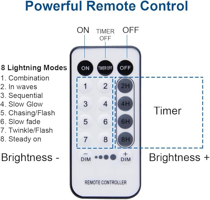 - 8 Lighting Modes: This holiday decorative string light has 8 lighting modes for you to choose: combination, in waves, sequential, slogs, chasing/flash, slow fade, twinkle/flash, and steady on. Fit different occasions and environment, adjust the lighting modes by using remote control or pressing the round button on the black mode controller box