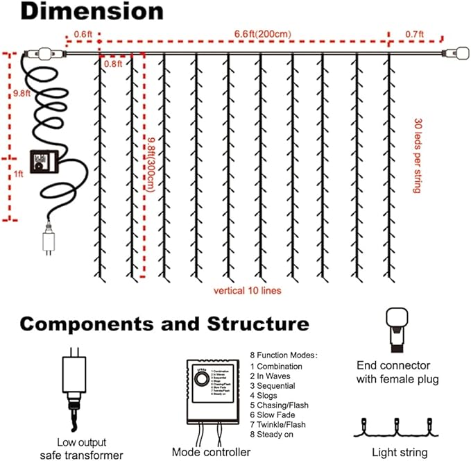 - Christmas Curtain Lights: Decorate with our 300 LED Christmas warm white curtain string lights with transparent wire, creates a warm festive atmosphere, surely lights up your room and house. A warm welcome sign at night to make your home a wonderful sight for your neighbors! US standard outlet, voltage 110V. Adapter to the first LED light: 9.8ft. Light size: 6.6 x 9.8ft