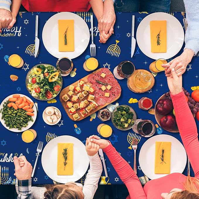 - Design for happy Hanukkah party:these elaborate Hanukkah tablecloths are beautifully designed with a sign of "HAPPY" and "Hanukkah" and printed with traditional candlestick, dreidel decor, star of Davids, menorah decor, jam round cake. It will definitely catch the attention of your guests and add a festival atmosphere to your Hanukkah theme party