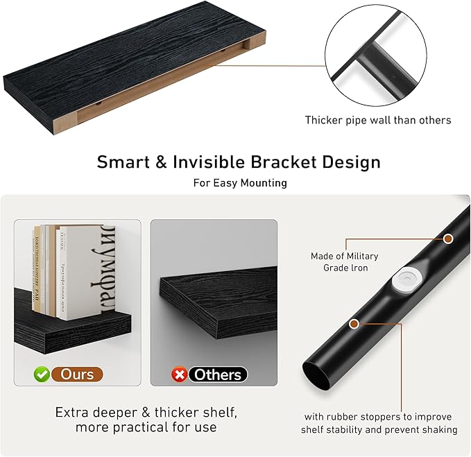 - 9 Inch Deep Design - This wall shelf measures 24"W x 9"D x 1.6"H. Extra deeper and thicker design in order to bring maximizes storage space and weight capacity, even hold up to 55 lb. This floating shelf taking up zero square feet, reduces clutter and highlights décor in compact spaces.