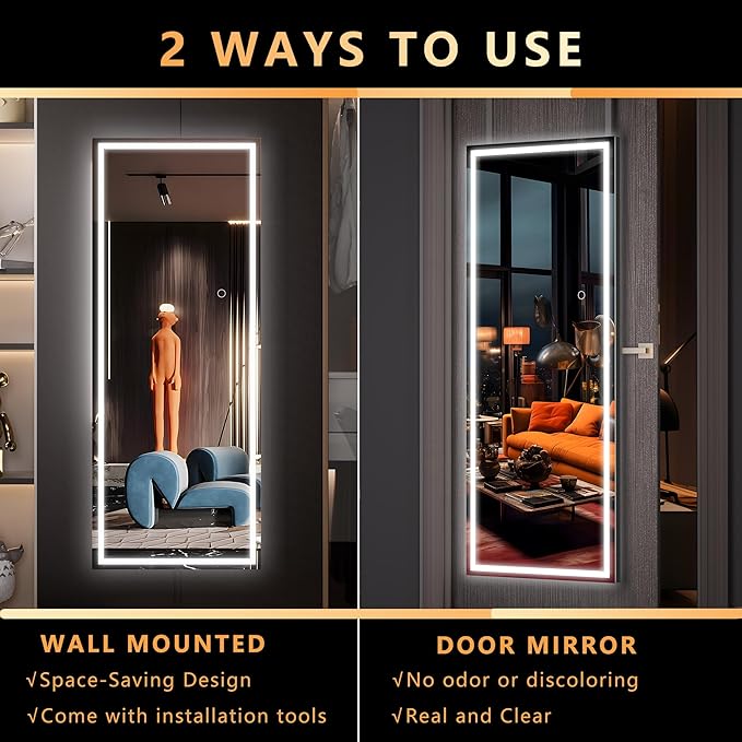 - 【Reliable & Safety Protection】The door mirror surface is clear and bright, giving distinct, lifelike image and well-lit reflection, more convenient for you to complete dress up or makeup. The full-length mirror is covered by an explosion-proof membrane for shattering prevention. It prevents the glass from falling even if the mirror is impacted by an external force, making it safer and more protective against injury.