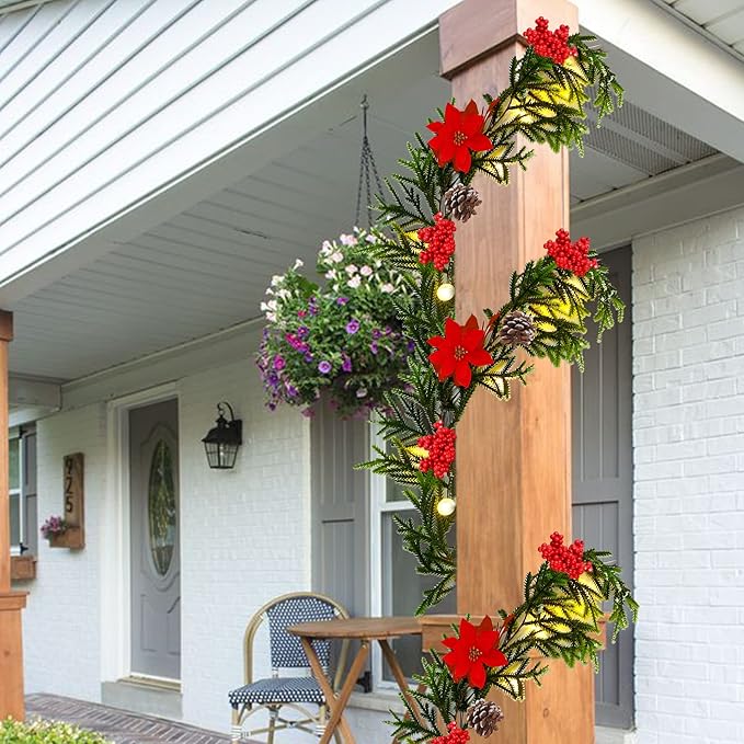- 2 Pack Lighted 9FT Christmas Garland: Christmas mantle garland measures 9 ft long, with individually crafted branch tips, decorated with 8 poinsettia flowers, 8 big pine cones, 8 red berries, create a lively feel to your holiday decor and match any of your existing Christmas decor