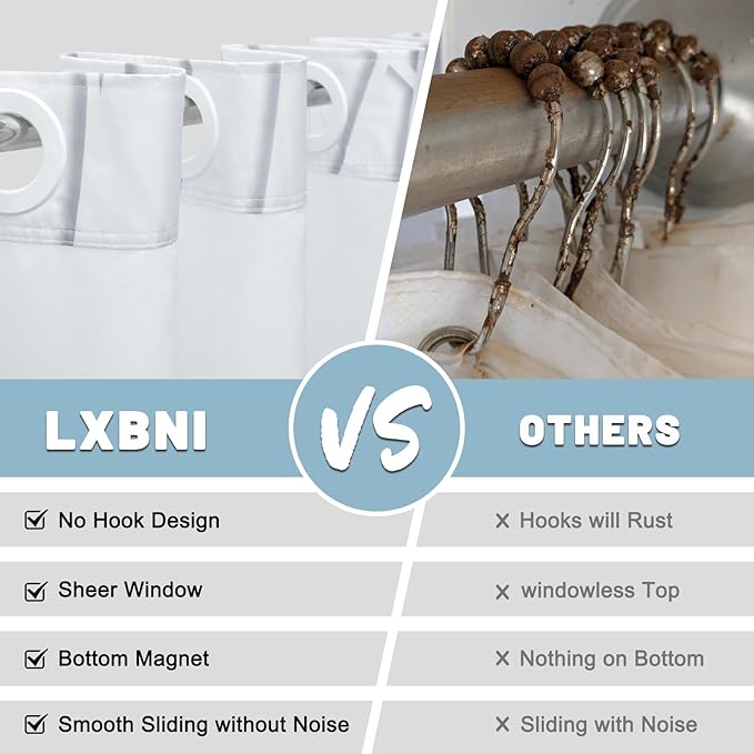 - NO Hook Design: set of shower curtain & snap on/off replaceable liner: no hooks needed design with built-in rings for easy on and off. snap-in waterproof fabric liner is removable when replacing