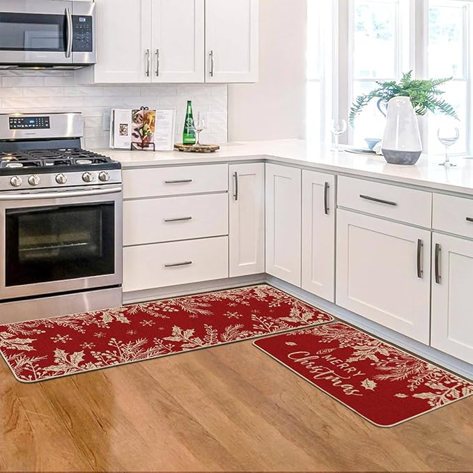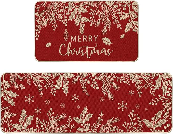 Artoid Mode Holly Pine Branches Leaves Merry Christmas Kitchen Mats Set of 2, Winter Decor Low-Profile Kitchen Rugs for Floor - 17x29 and 17x47 Inch