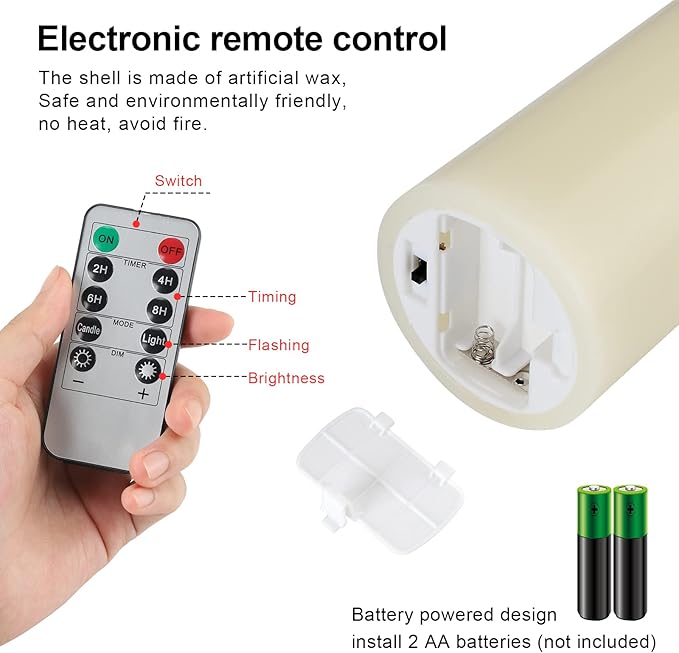 - HASSLE FREE OPERATION: For easy operation from the comfort of your sofa or bed, you will also receive one remote control with range 16.4ft that operates all candles. This 10-key remote control allows you to set timer on your pillar flameless candles per 2H, 4H, 6H, or 8H, while you can even time them to automatically turn on or off. With this super convenient remote you can enjoy the relaxation of your candles without worries.