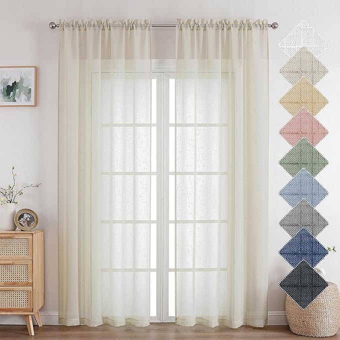 - Light Filtering linen Curtains: These linen sheer window curtain panels have primitive and natural effect make the sheers more draped and aesthetic, Linen textured semi-sheer not only appears an elegant look without wrinkles but also adds a soft touch. Unlike ordinary sheers, the Line weave creates a half-transparent view. Provides a harmonious window dressing and makes your home lively.
