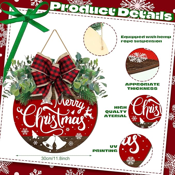 - Christmas Element Design: our Christmas wooden sign is printed with [Merry Christmas] words, decorated with red and black buffalo plaid bows and eucalyptus leaves on the top, they can be hung with twine, very delicate and festive, very Christmas atmosphere let, let you spend an unforgettable Christmas