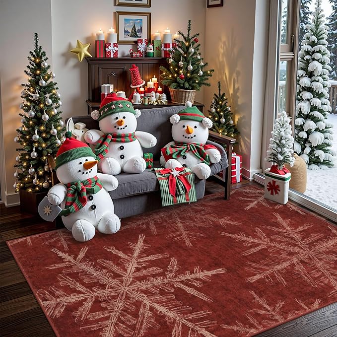 Lahome Christmas Washable Area Rugs, 3x5 Snowflake Entryway Rugs Indoor Non Slip Washable Red Rugs for Bedroom Holiday Decor, Soft Ultra-Thin Carpet for Living Room Kitchen Bathroom(3'x 5',Red)