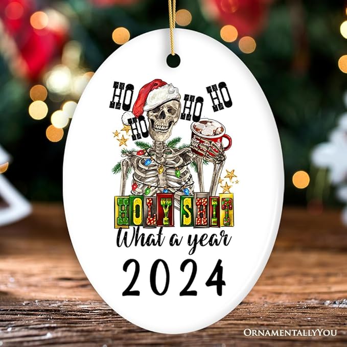 Ho Ho Ho Holy Sh*t What a Year Christmas Ornament, Funny Festive Skeleton