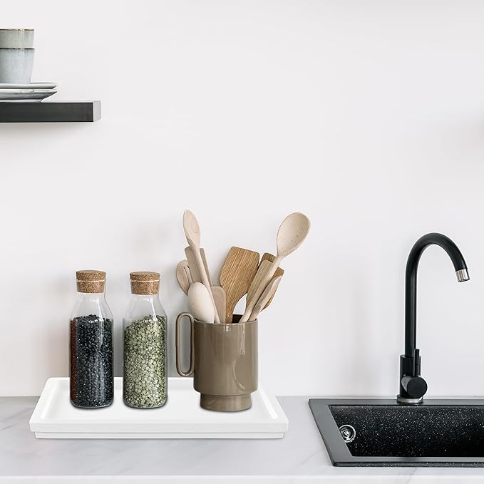 Acacia Rectangle Organizer Tray - 11.8 x 5.9 Inches, Soap Tray for Bathtub Countertop Sink Dresser Toilet Tank - Home Decoration for Jewelry Dish Key Plate (White)