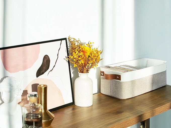StorageWorks Narrow Storage Bins, Small Baskets for Organizing, Long Storage Basket with Handles, Fabric Storage Bins for Shelf, Brown and White, 2-Pack