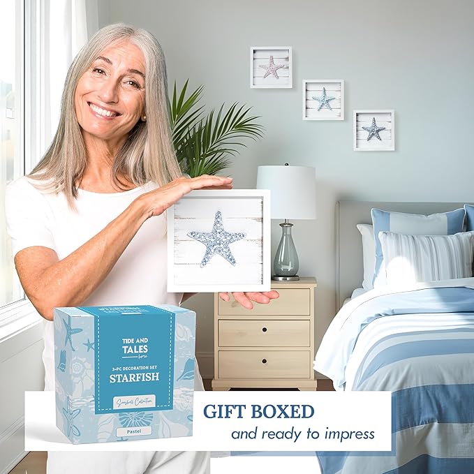 TideAndTales 3D Starfish Wall Art (Framed Set of 3) Coastal Theme Wall Hanging Decoration for Bathroom or Tropical Bedroom, Ocean Inspired Seashell Decor for Home or Beach House (7"x 7")