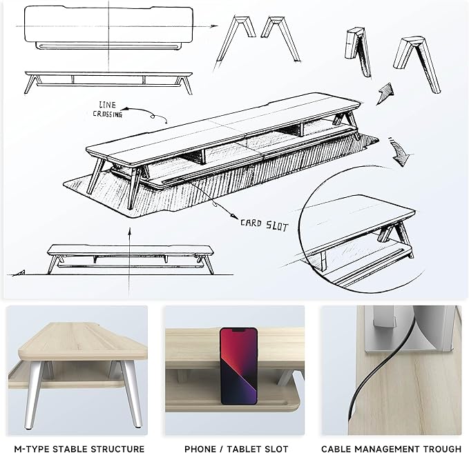 - 【2 TIER DESKTOP ORGANIZER】At longest 42.5inch wide,longer size with more space. This laptop riser is big enough to support two monitors. It has 1 universal device holder slot and 3 high capacity compartments. You can easily store your office accessories & supplies under your monitor stand to keep your desktop tidy. Our monitor stand rise comes with cable management slots that can make your cord stay organized.