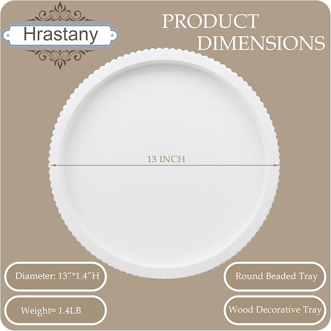 Round Wood Serving Tray with Beaded, 13” Rustic Wooden Decorative Coffee Table Tray for Centerpiece, Ottoman, Farmhouse Circle Trays for Counter, Living Room, Home Decor (White)