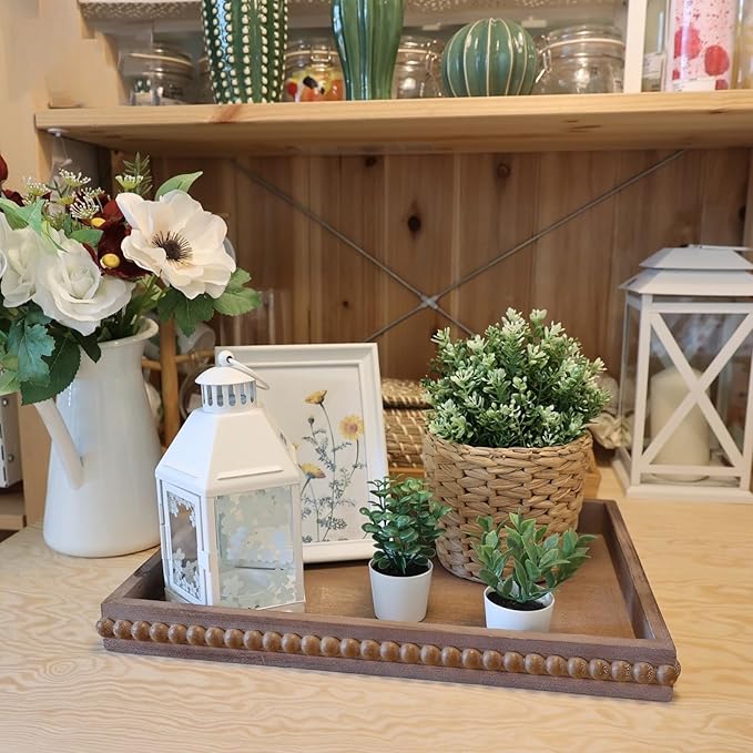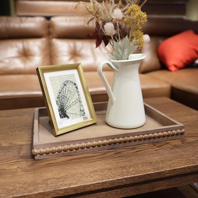 Wood Decorative Tray, Distressed Outdoor Serving Tray with Wooden Bead for Ottoman, Coffee Table, Entertaining, Home Decor, Rectangular 15.7”*11.8”*1.57” (Retro Brown)