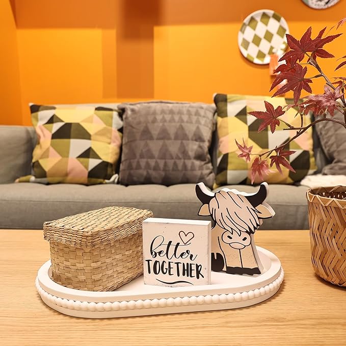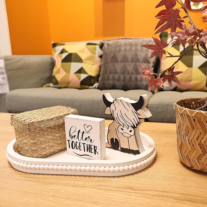 Oval Wood Serving Tray with Wooden Beads, Outdoor Farmhouse Decorative Tray for Ottoman, Coffee Table, Kitchen Counter Organizer, Home Decor(White)